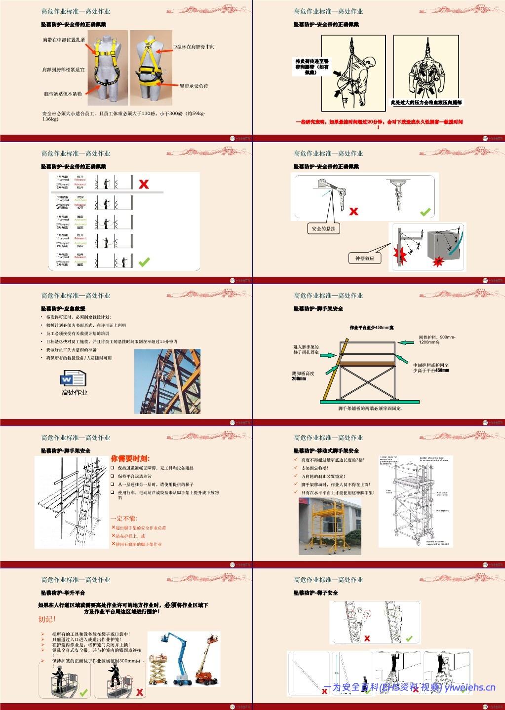 坠落防护:按优先级采取防护措施 —— 坠落防护系统(护栏、盖板)→限位系统(限位绳索)→坠落制停系统(安全带、锚固点),强调安全带需正确佩戴(臀带承重、D 型环在肩胛骨中间),且悬挂时间不超过 15 分钟以防下肢损伤。