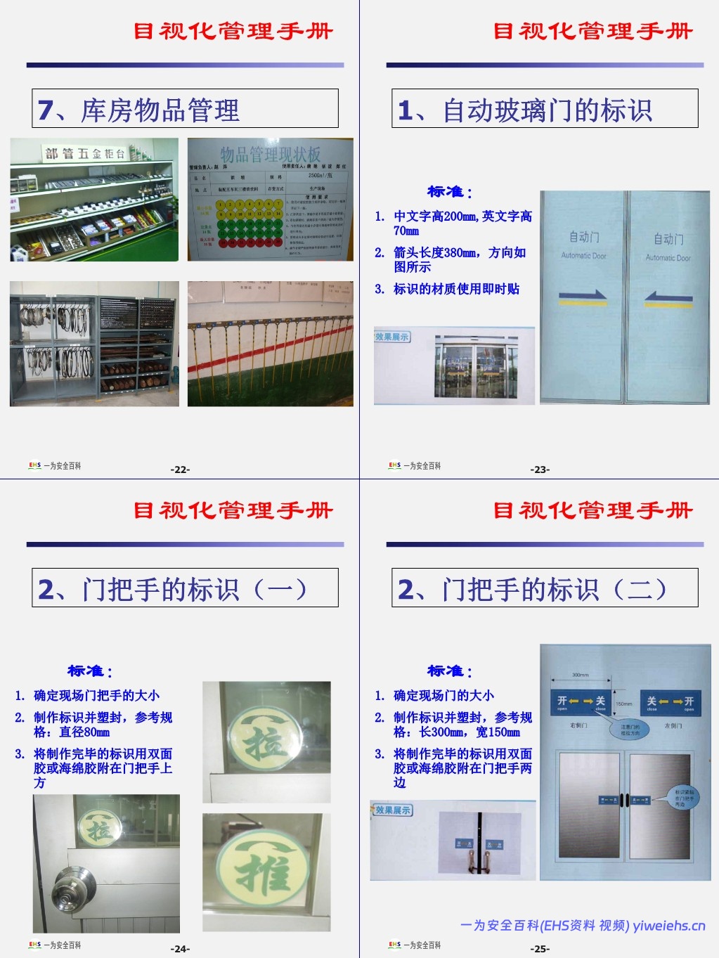 门把手标识:分两种,一种参考直径 80mm 规格制作塑封标识贴于门把手上方;另一种长 300mm、宽 150mm,贴于门把手两边,适用于侧面推拉门,明确开关方向。