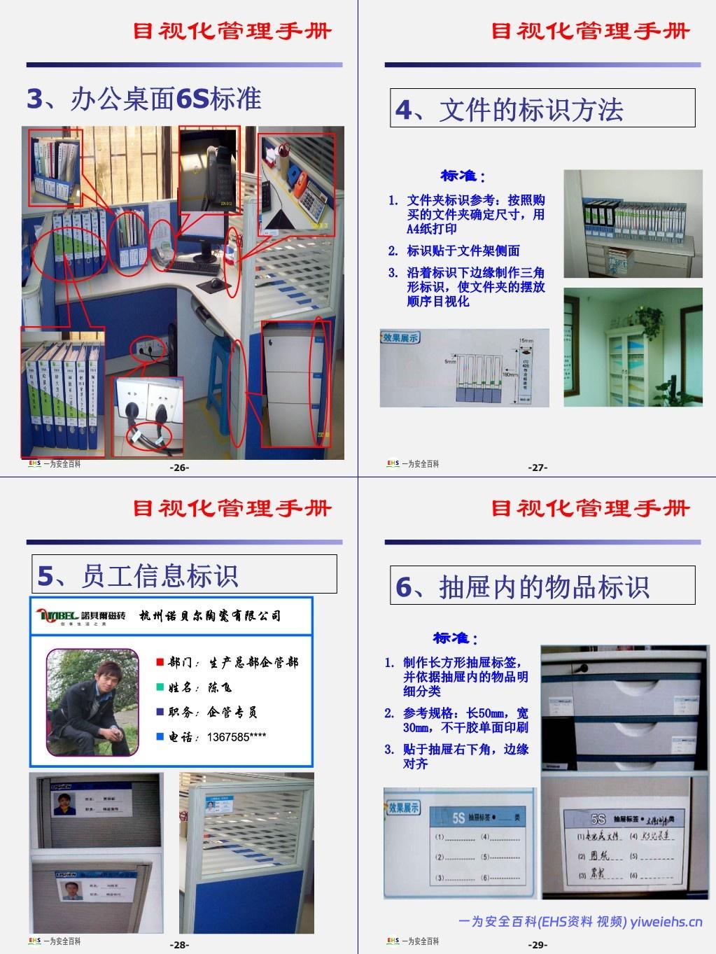 办公桌面与文件管理:桌面物品摆放有标准,文件标识贴于文件夹侧面(上边距顶端 5mm,含企业标志),下边缘设三角形标识明确摆放顺序。