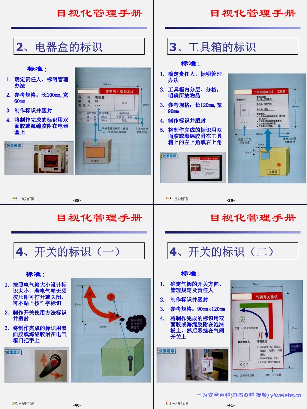 电器盒与工具箱标识:电器盒标识长 100mm、宽 60mm,塑封后贴于上部中间,明确责任人与管理办法;工具箱标识长 120mm、宽 90mm,贴于角落,内部分层分格,标注物品与管理规定。