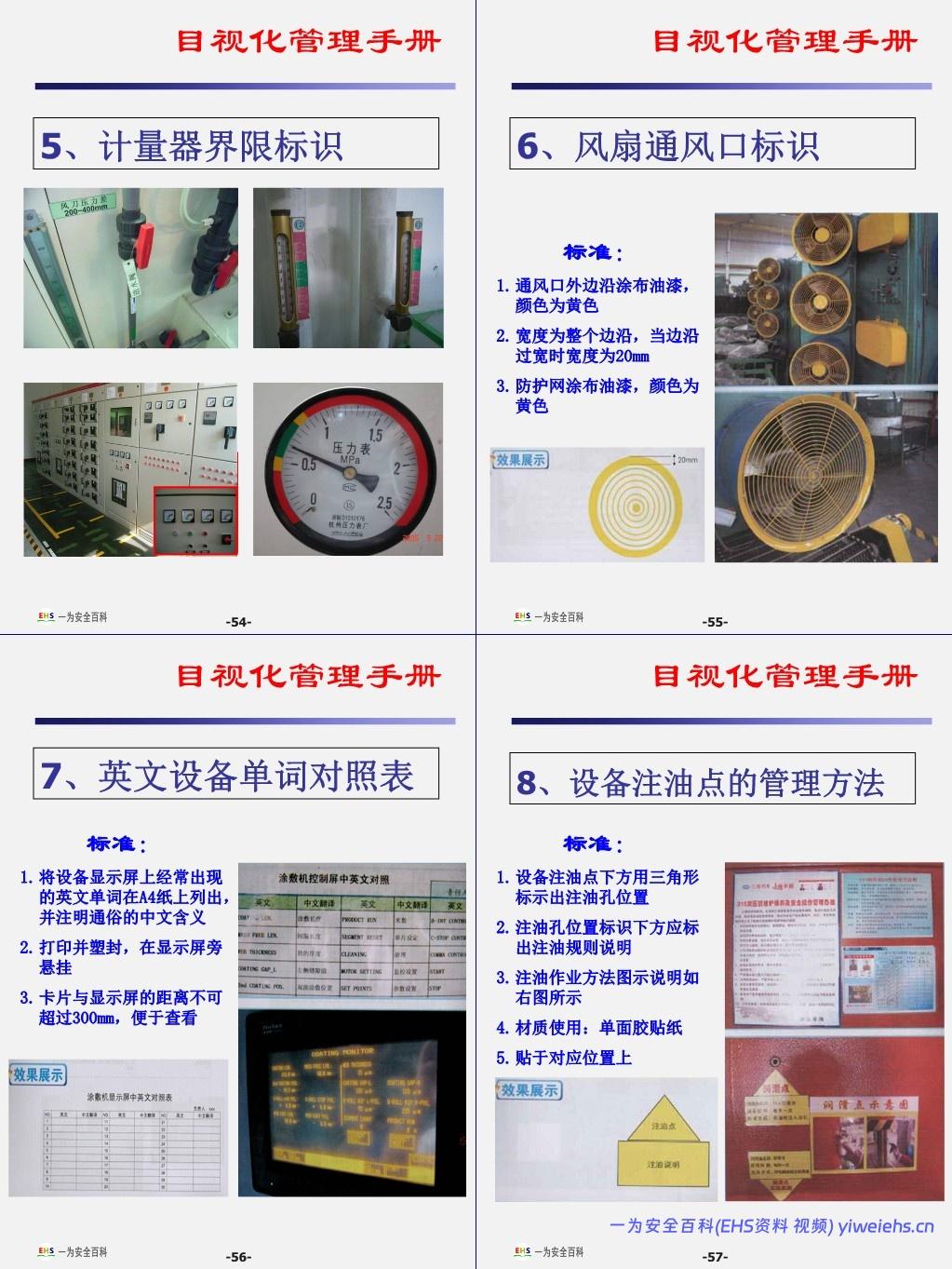设备注油点与润滑油供油管理:注油点用三角形标示位置,下方标注注油规则与方法,用单面胶贴纸;按供油表供油,区分润滑油枪并贴标签,防污染与用错油。