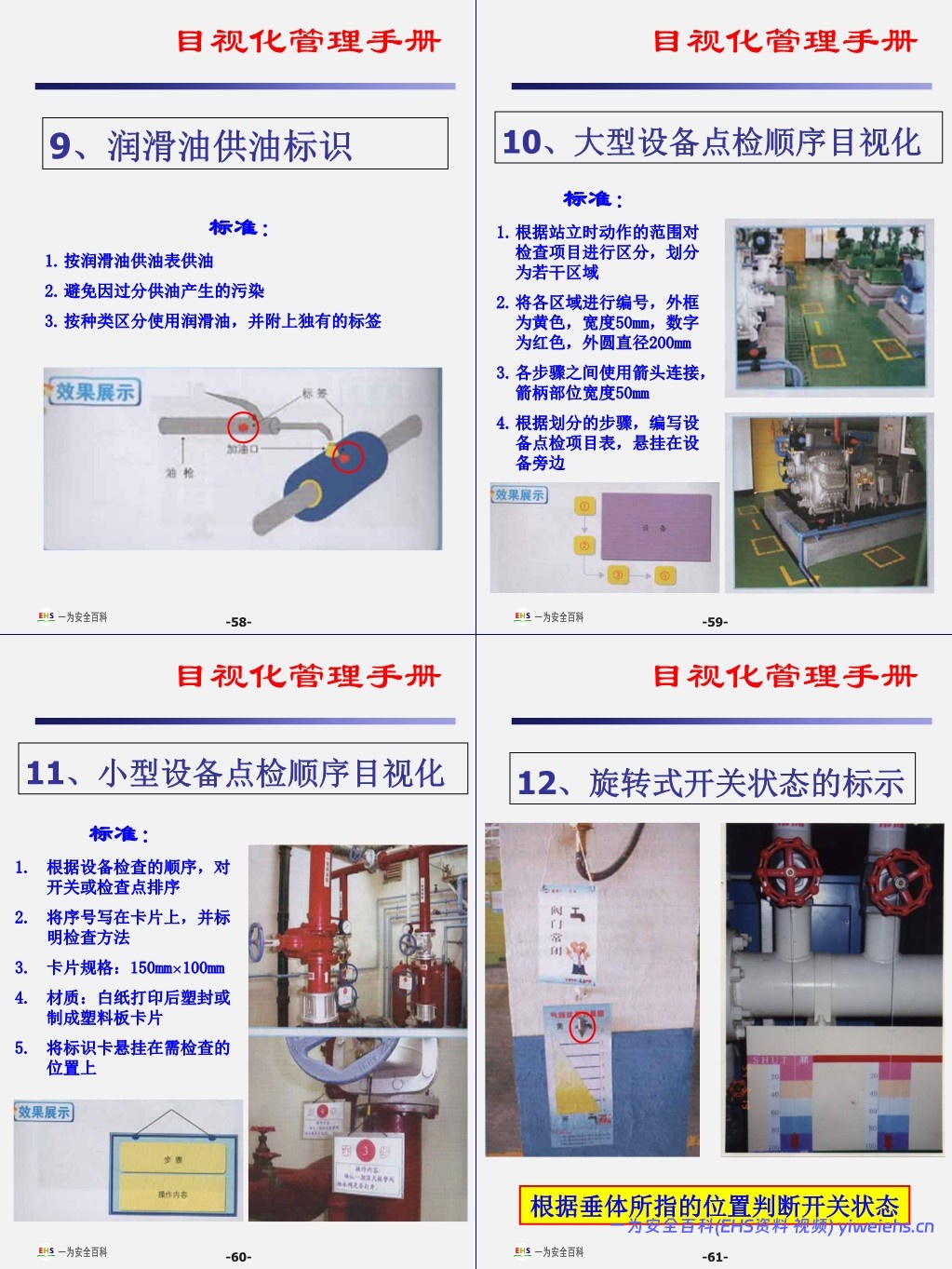 大、小型设备点检顺序目视化:大型设备按动作范围分区编号(黄外框 50mm 宽,红数字,外圆直径 200mm),箭头(柄宽 50mm)连接步骤,配点检项目表悬挂;小型设备按检查顺序对开关 / 检查点排序,150mm×100mm 规格卡片(白纸塑封或塑料板)标注序号与检查方法,悬挂于检查位置。