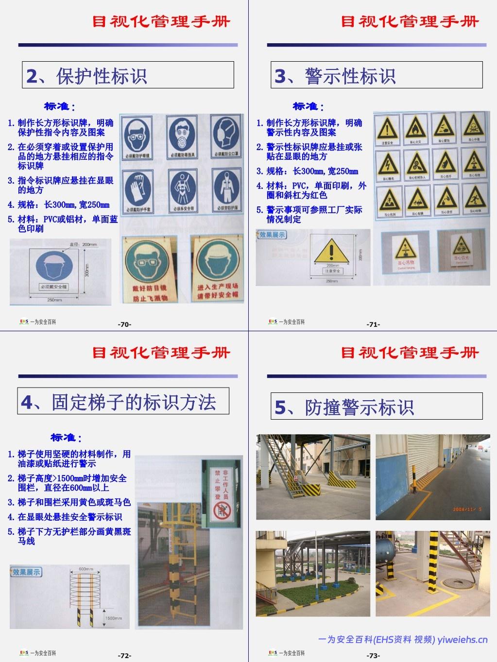 固定梯子标识:用坚硬材料制作,油漆或贴纸警示,高度>1500mm 加直径>600mm 安全围栏,梯子与围栏为黄色或斑马色,显眼处挂警示标识,下方无护栏部分画黄黑斑马线。