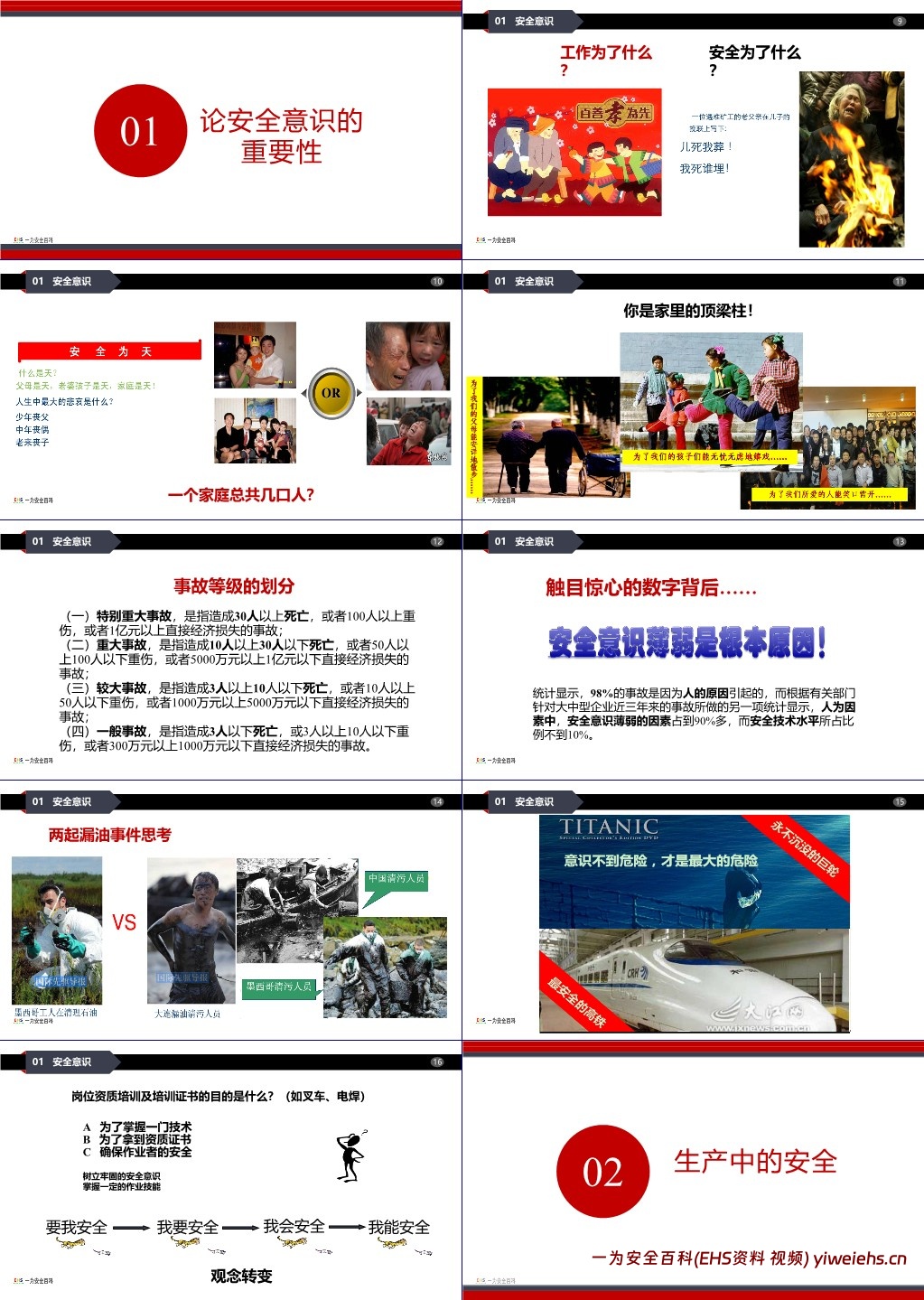 安全意识的重要性:指出安全对个人和家庭的意义,明确事故等级划分标准(特别重大、重大、较大、一般事故),强调 98% 的事故由人为因素导致,其中安全意识薄弱占比超 90%,倡导安全观念从 “要我安全” 向 “我要安全、我会安全、我能安全” 转变。