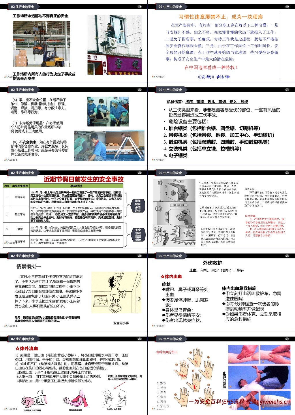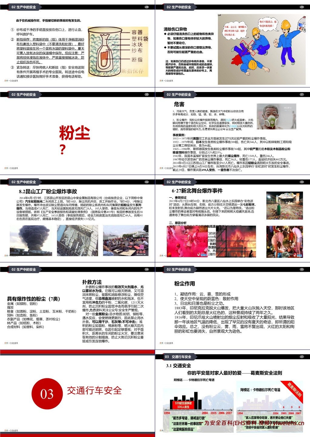 生产中的安全:分析生产中的不安全行为(如攀坐危险位置、未规范使用劳保用品等),列举机械伤害的常见类型及危险设备,介绍节前生产事故案例;讲解外伤急救知识(止血、包扎、断指保存等);重点说明粉尘的危害(污染健康、引发爆炸)及典型粉尘爆炸案例(如昆山工厂、台湾新北舞台爆炸),并给出扑救方法。
