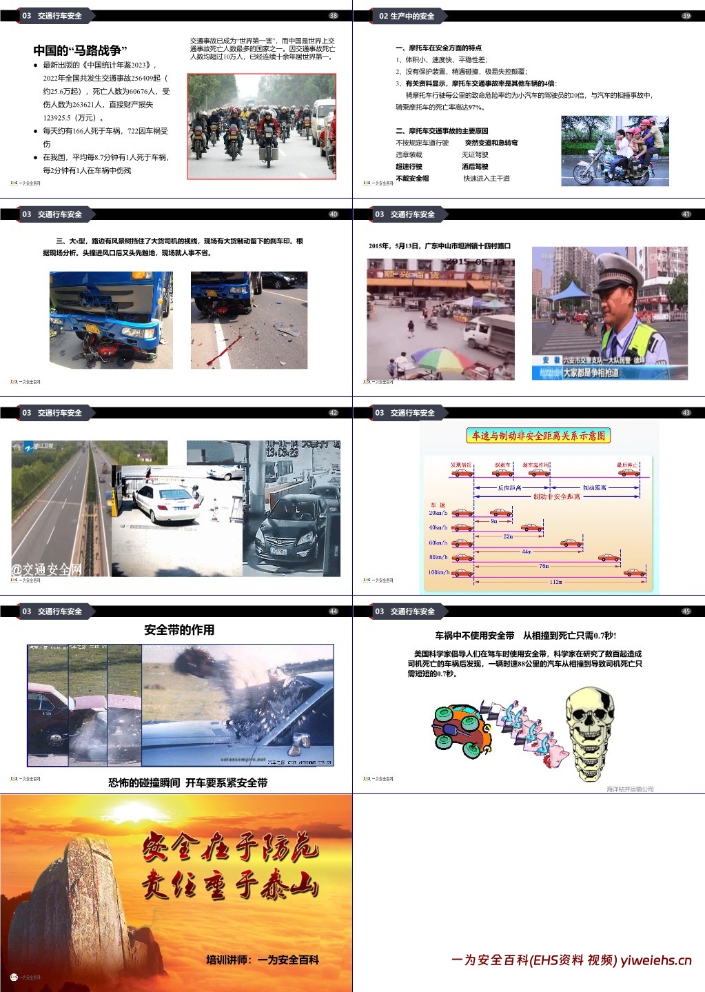 交通行车安全:引入葛麦斯安全法则,强调平安对家人的重要性;列举中国交通事故数据(2022 年约 25.6 万起事故,6 万余人死亡),分析摩托车事故特点及原因;说明车速与制动安全距离的关系,强调安全带的重要性(车祸中不系安全带从碰撞到死亡仅需 0.7 秒)。