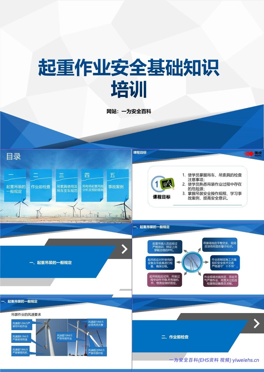 该文档为《起重作业安全基础知识培训》课件,共51页,主要面向风电场等高风险作业环境中的起重吊装操作人员,旨在提升其安全意识与规范操作能力。内容结构清晰,分为五个主要部分: